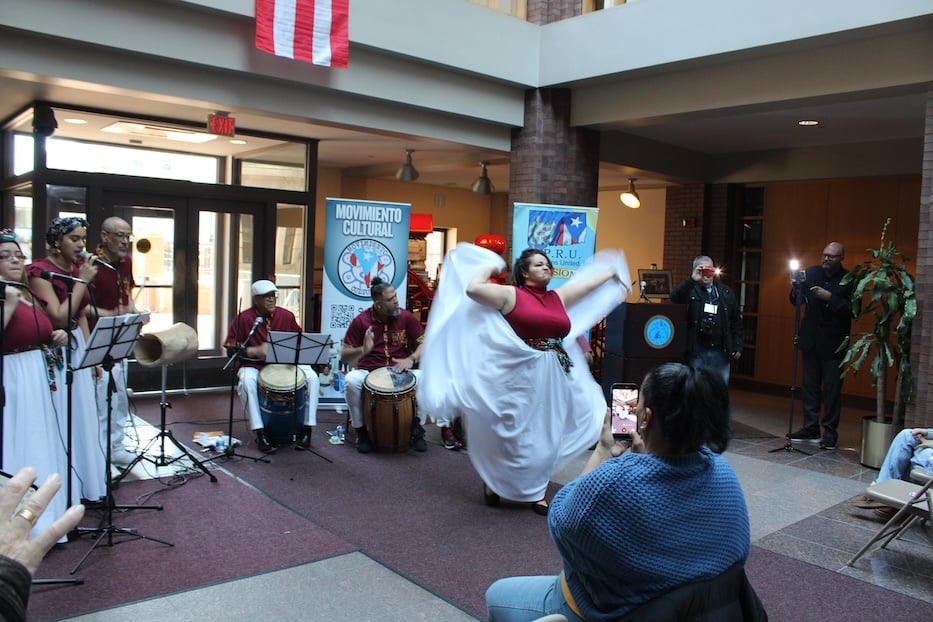 Drums rolled through the vast, first-floor atrium of City Hall, making their way from the floor to the ceiling as an audience leaned in, and the words to "De Bandazo" made the air feel thick, electric. Beside a podium, drummers hammered out a seis corrido rhythm that closed the gap between Puerto Rico and Connecticut, between 1873 and today. As she glided to the center of the room, pulled by the sound, Brendalíz Cepeda bowed to the drummers, and then began to move.