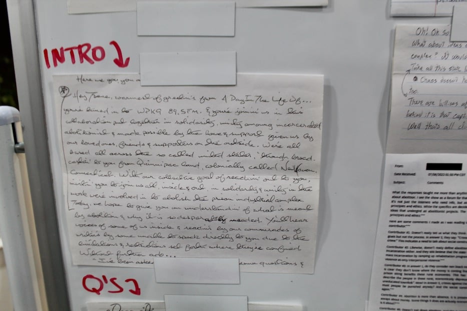 Episodes—from research, recording, and editing to intro music and cover art—are deeply participatory and happen by a process of majority vote and consensus. While A and Luna do much of the logistical and production work, both stressed that the focus of the show is on the individuals who are incarcerated, and use their lived experience inform their work around abolition . During a recent launch of the show at Possible Futures, the two assembled a board showing how the first episode was made, with dozens of written responses that ultimately became a 49-minute collage of voices from the inside.
