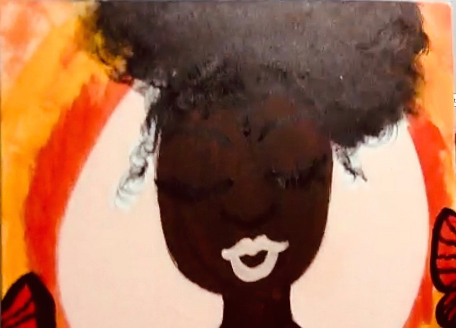 As she painted, a form began to take shape. She swirled her brush in water then dipped it into brown acrylic. Brush hit canvas—it was a bust of a woman, dark-skinned against a white backdrop. Creamy pink formed large, smiling lips. A fan brush doused in black fashioned a tuft of hair. Ladson detailed monarch butterflies at the painting’s edge.