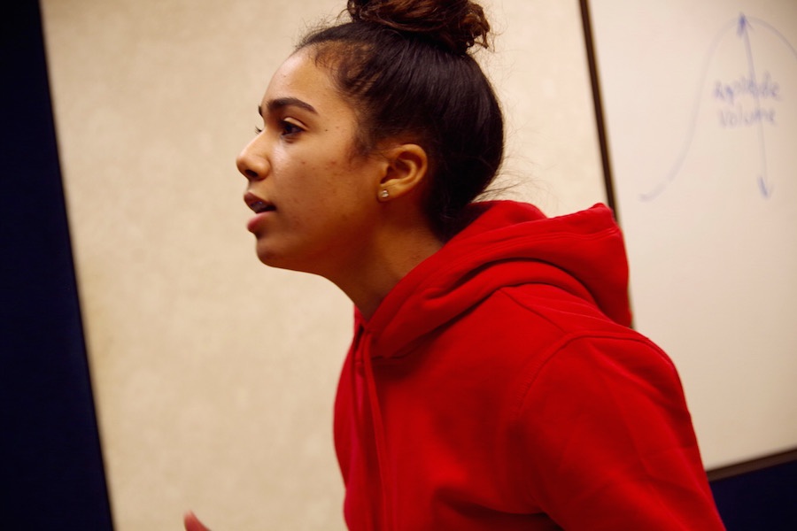 During these sessions, students are critiqued by drama teachers, theater educators, and directors—but also by each other. Huddling into smaller groups of three and four after their warmups, students migrated to different corners of the room, running lines one at a time. In one group, Justyn Velez said he was channeling his dad, a proud Boricua who talks about getting pulled over because of his darker skin, before launching into a monologue from King Hedley II.