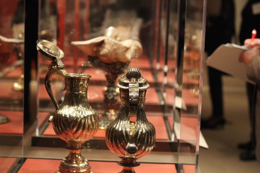 A pair of silver and gilt flagons, cup with a strombus shell, two Nautilus cups, and a mother-of-pearl perfume flask, assembled in India all join the painting in the first part of the exhibition.