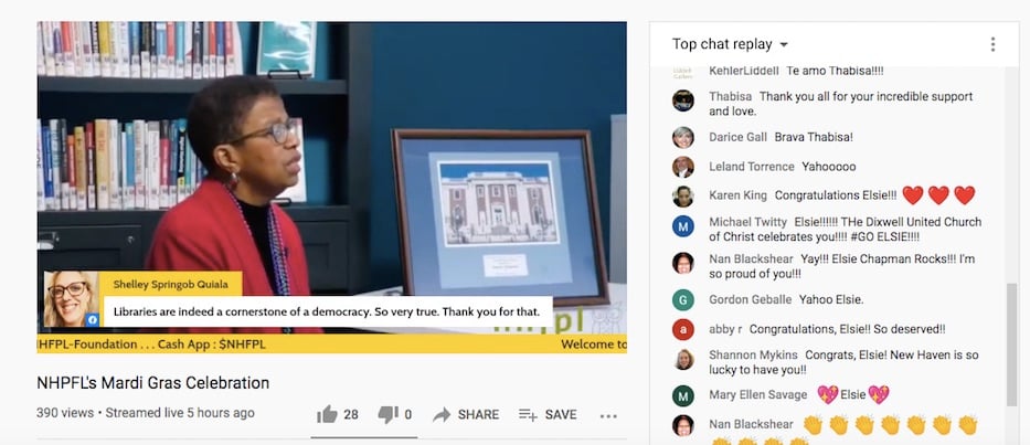 Accepting the award against the familiar blue walls and bookshelves of Ives Squared, Chapman praised the library for continuing to provide resources during Covid-19 and a year of social upheaval, as the city faces a financial crisis and a reckoning with its own entrenched racism and white supremacy. In the past 11 months, branches of the NHFPL have reopened their technology centers on a limited capacity basis, continued curbside pickup and daily online programming, and lent out hundreds of WiFi hotspots. Last summer, the library also went fine-free for the first time in its history.