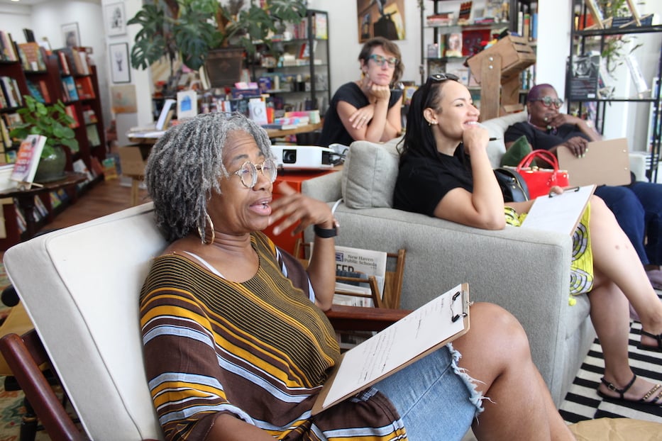 On one side of the room, lifelong New Haveners Babz Rawls-Ivy and IfeMichelle Gardin began to write down their thoughts, letting the relative stillness of the room double as their muse. At some point, dinner arrived, and the fragrance of Iraqi food from the Westville restaurant Rawa floated through the space. Glasses of Lost Poet wine flowed and attendees nibbled and sipped as they wrote.