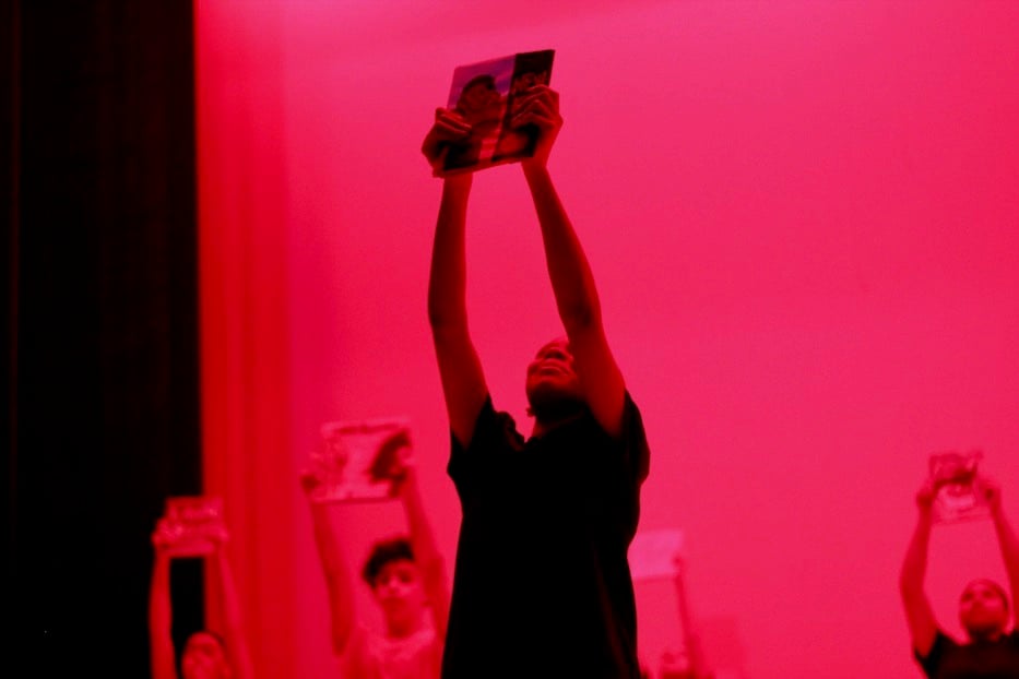 As they moved slowly, deliberately through a sea of red light, their t-shirts and jeans brought the message home: this could happen to young people anywhere, in any classroom, with little notice. When the class ended in a line, their right fists raised in the air as their left hands held out the covers, the act of reading felt like a sacred and endangered gift.