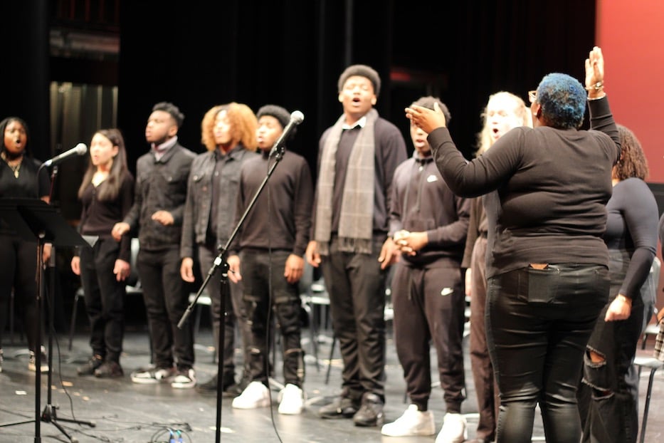 Students were just getting started. Weaving in poetry and song, they paid homage to artists past and present, from Koleka Putuma and Sam Cooke to oral traditions that have been passed from generation to generation. No sooner had a dozen choir students shuffled onstage than senior Anniya Taylor-Beam lifted her hands, and ushered in centuries of history.