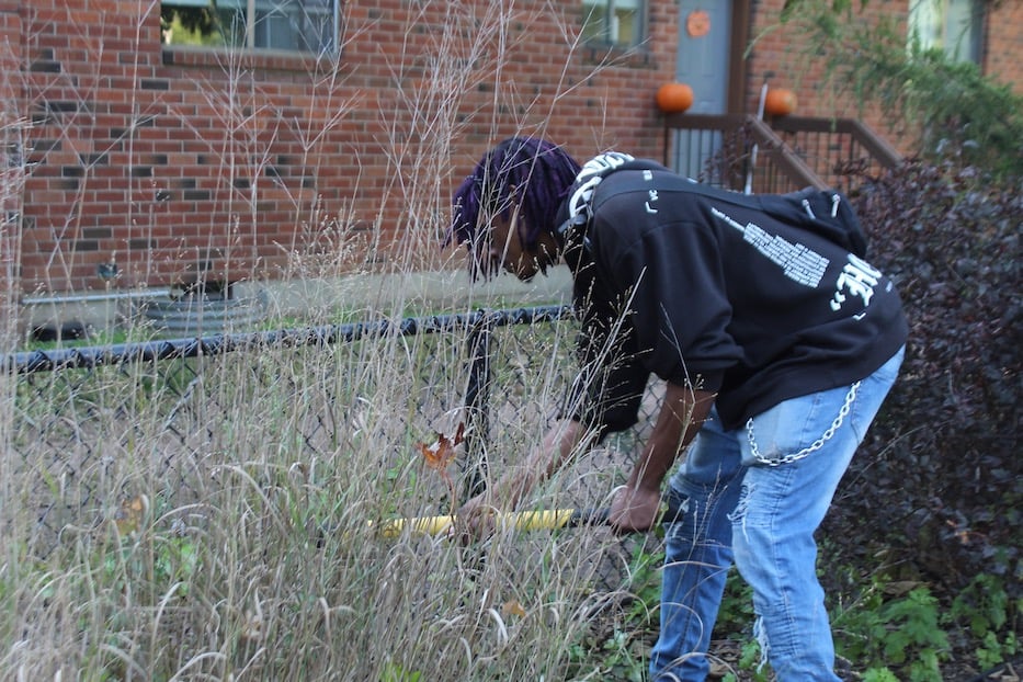 As they worked, the billboards slowly took shape. On the sidewalk, Friedes worked with Peterson and Moye to steady a post, measuring it every so often to make sure it was at least three feet under ground. Knee-deep in a patch of tall grass nearby, Fleming and Khalif Johnson worked to lower two seven-foot posts into the ground, using the flat side of an ax as a makeshift hammer. Every so often, Johnson stopped to step in with a leveler to see if it was standing correctly.