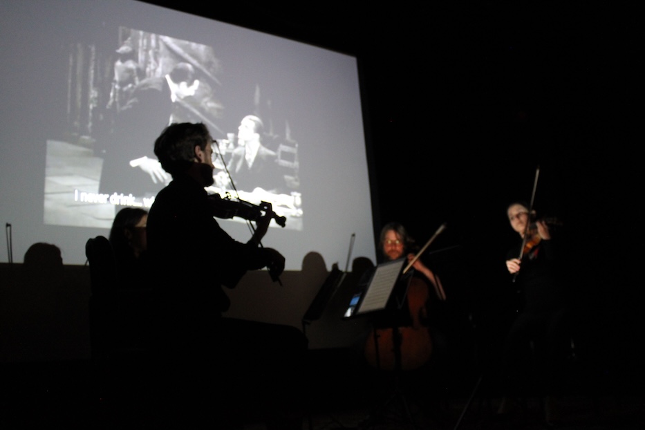 They came from the four silhouetted musicians sitting on stage in front of the black and white film. Metronomes balanced on their music stands, they faced one another and silently communicated cues, checking their sheet music before looking back over at one another and beginning the music for the next scene.