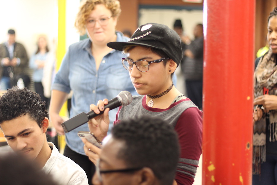 | Top: Nearing and Levey-Burden explained that ground rules included speaking from the "I," using one microphone, naming potential impact and trusting intent, and debating an idea rather than the person pitching that idea. Bottom: Kassandra Martel spoke on immigrant rights in the city, drawing applause as they announced "we want ICE out of our community!" |