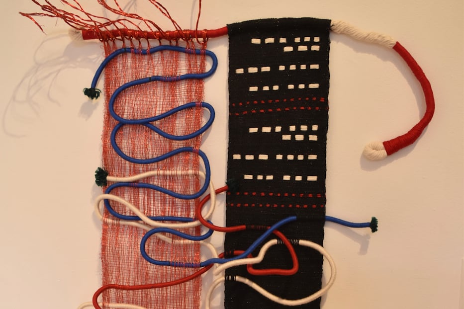 Kathie Halfin’s sculptural tapestry Svo-bo-dy!_#1 combines seemingly disparate styles as Halfin “utilizes textile as a code” to explore language, history, and resistance. On the right side of the textile, morse code dots and dashes stand out in white and red against a black background, the weave tight and regular. On the left, shimmering red fibers join together in a loose and flowing weave. Chunky cords weave their way in and out of this red fabric, looping and turning.