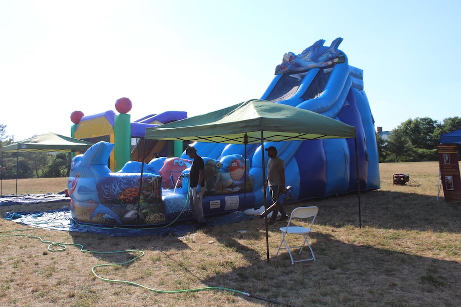 Across from the table, to the right, kids of elementary school age bounced loudly and peeked through the black mesh of a bouncy castle and water slide. A tent perched above the entrance of the castle, to provide shelter from the sweltering sun. Representatives from the Youth & Recreation Department hosed off the waterslide every once in a while.