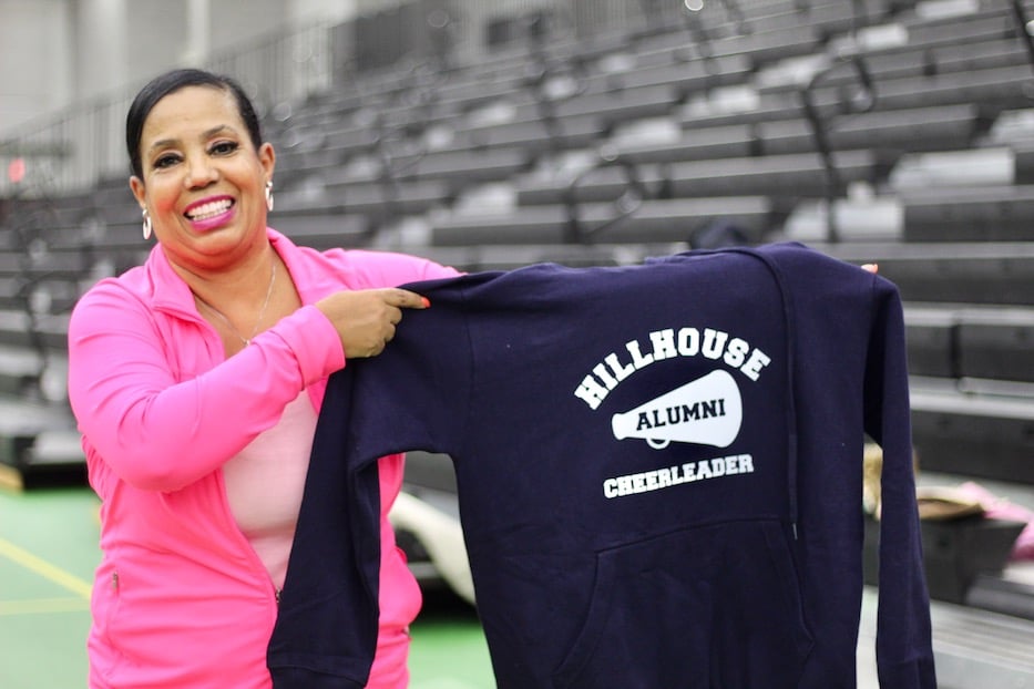 Nearby, Greater New Haven NAACP President Dori Dumas showed off a navy blue hoodie that is half of the team’s blue-and-white sweatsuit uniform for Thursday. On the front, each hoodie reads “”Hillhouse Alumni Cheerleader,” with the white outline of a spirit cone. On the back, they include each member’s graduation year.