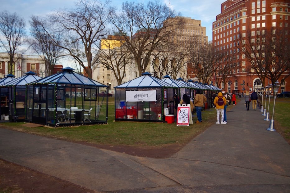Alli Greenberg and James Cofrancesco’s small business The Junk Drawer was one of several to pop up on the New Haven Green earlier this month, at a winter market meant to usher in the holiday season. As Christmas music sailed from speakers set up nearby, vendors sold a mix of clothing, jewelry and trinkets, bath and body products and other locally made goods. The sweet, sugary smell of a Many Donuts station hung in the air, inviting people to stay a while.