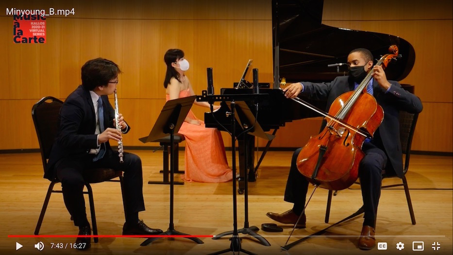 An anonymous donor made it possible to pay for a recording space and subsidize the tickets. Because Kang wanted “to give back to the community a little bit,” ten percent of the proceeds from each concert are donated to a local nonprofit, starting with the New Haven Scholarship Fund. Concerts are recorded before they air; rehearsals entailed players in masks and separated by a shower curtain for droplet protection from the flute.