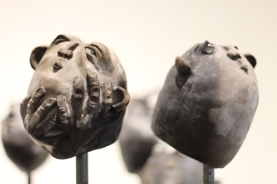 The figures turn their faces to the sky, eyes wide and wondering. Their cheeks are full, their heads round with dainty ears. In the front of the pack, one head rotates in place, thick, knotty fingers spanning its chin. Another smiles a long, tired sort of smile, completely unperturbed by the small bird on his brow. Another lifts its chin heavenward, lips gathered in a tiny O.