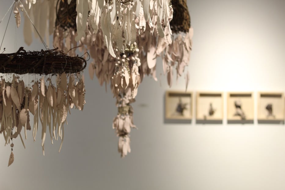 That kind of thrill also flows through Duchen’s works, a collection of ceramic figures and glazed wares that fold in a playful, often poetic elegance of form. In hanging works from her Porcelain Tendril Collection, she plays with weight and heft of her substrate, asking a viewer to look once (or twice) from far away, and then come closer. From across the gallery, the porcelain looks feather-light and luminous, as though the tendrils might in fact be cherry blossoms, ready to drop at any second. They only become more delicate, and differently alive, the closer one gets to them. Her materials are just as interesting: the tendrils hang from twig, bead and wire chandeliers.
