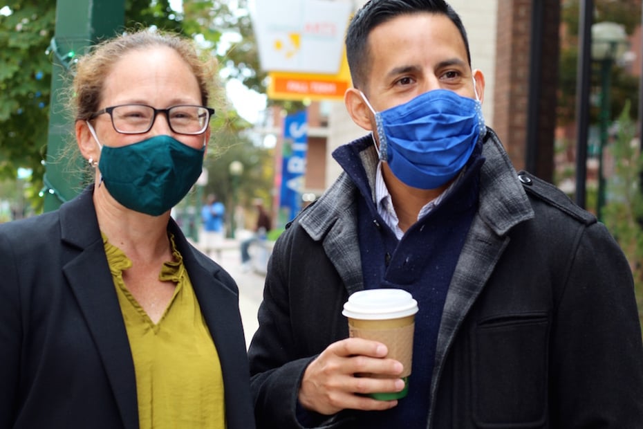 Top: Long Wharf Theatre's new administrative home at 70 Audubon Street on Tuesday, Oct. 4. Bottom: LWT Managing Director Kit Ingui and Artistic Director Jacob Padrón on Audubon Street in October 2020. During a press conference they attended that month, Gov. Ned Lamont announced $9 million in federal CARES act funding to arts organizations across the state. Lucy Gellman Photos.