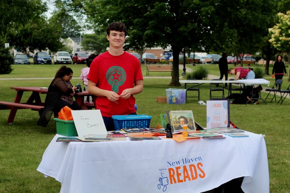 Top: Nicholson and Robbins. Bottom: Owen Lamonthe, there with New Haven Reads. Other partners included Long Wharf Theatre and the Dominate The Day Foundation.