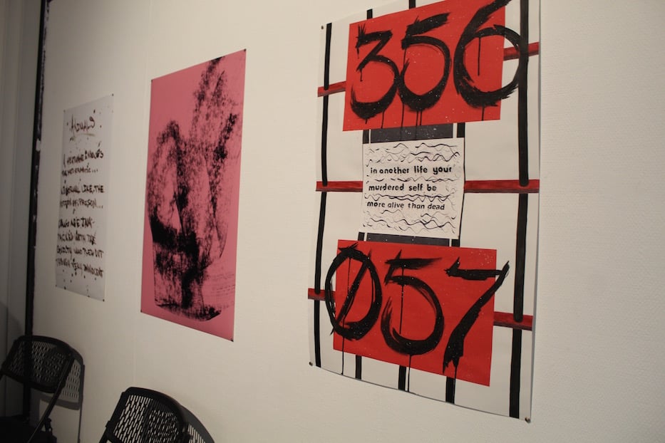 There is lively, often compelling cross-talk between pieces, which play with line break, spacing, and illustration as they reinterpret and repackage the book’s contents. Horton’s words vibrate and thrum through pairings such as Joy & Pain in Residence, Smudge I and Murdered Self, placed side by side at the back of the gallery. In Smudge I, an inkjet print with no artist’s name attached to it, a thick, smoke-like smudge of black charcoal winds down and across a pink page, giving it the appearance of a rubbing. Beside it Murdered Self shows inmate number 356-057 painted in black against red construction paper.