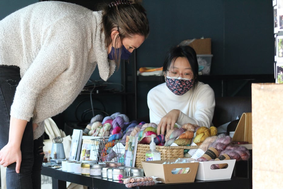 “My customers love it here and so do I,” she said. Sunday was her third weekend hosting at the cafe. Nearly everyone who stopped in came by her table to chat and check out her wares which included yarn, candles, and hand-knit mug sweaters. Some customers even came by with their own yarn and needles.