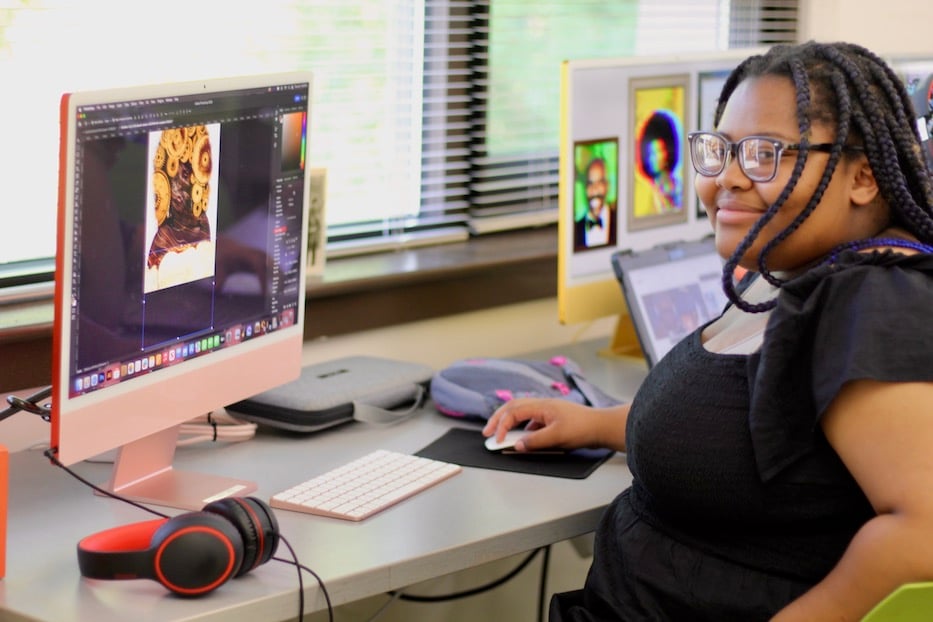 On a recent Thursday, nowhere was that clearer than in the Mac lab itself, as students worked diligently on art and music projects before their parents picked them up for the day. In one corner, 10-year-old Samara Dae Mayes listened to music, finding a vibe before putting the finishing touches on a self-portrait that she was doing in Photoshop. Over the doorway at her back, a sign cheerily read “It’s A Great Day To Create!”