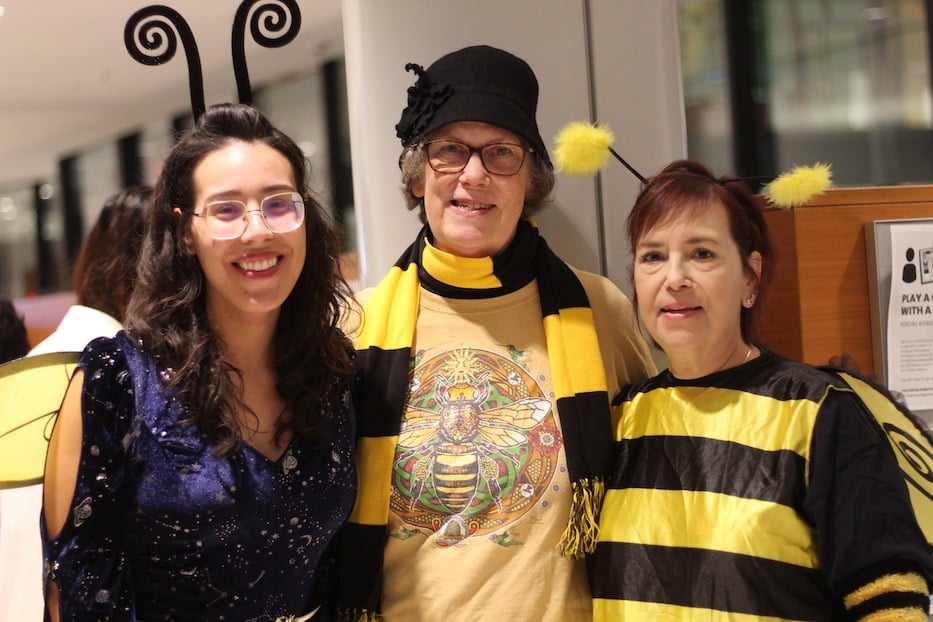Even before it began in the building’s bright auditorium, the bee buzzed with energy, teams running over last-minute spelling preparations (can you spell “Laryngectomy?” What about “Butteris?”) and checking to see that their costumes, all manner of yellow-and-black striped headbands, beekeeper suits, see-through and glittery black wings and Halloweeny witch hats, were ready for the stage.