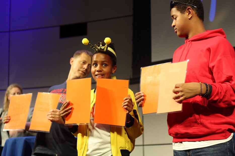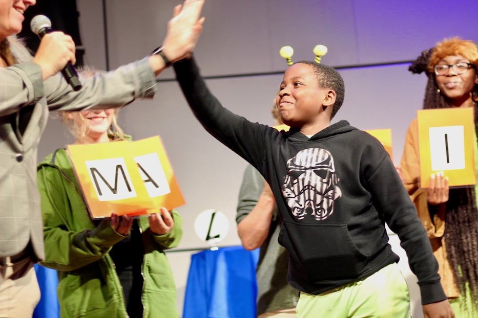 Fifth grader Grant Harris was on a roll. In front of him, a line of volunteers rearranged a series of letters into the word M-A-G-I-C-A-L, giggling as the audience jumped in with suggestions. He bounced around the stage, studying the word. In the audience, his mom and dad watched every move with bated breath. Grant raised his arms above his head in a show up victory, as a smile burst across his face.