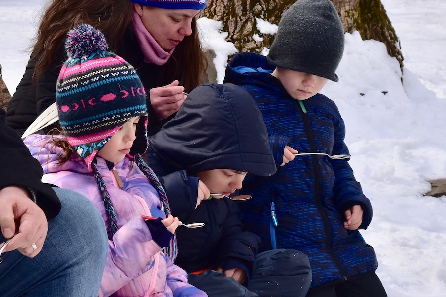 Later, it was time to head to the sugar shack, where maple sap is transformed into liquid gold. Standing outside the small wooden out-building, the children guessed how many gallons of sap are needed to make one gallon of maple syrup: One? Twenty?