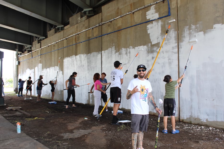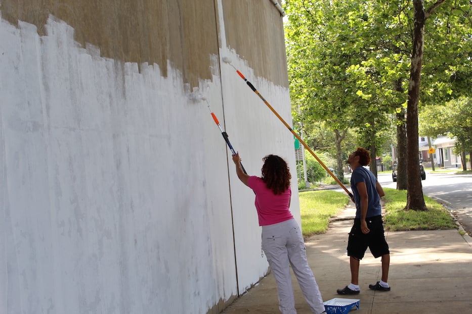 Now, he added, it’s going up in a series of weeks. In the sticky, bright mid-July heat earlier this month, a handful of attendees from the Fair Haven neighborhood came out to prime the wall, covering it with white paint before Perez could start putting down a design. Even as the sidewalk warmed and heat turned the underpass into an outdoor sauna, several people said they were excited to help the artist bring his vision to life.