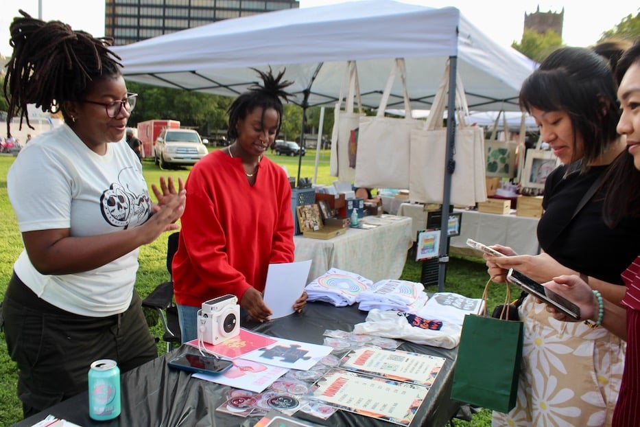 Top: Artist Tiffany Hsu, who is an ER nurse by day and a crochet artist by night. Bottom: New Haven Pride Center Producer Jahnice Cajigas and Jamila Washington. Lucy Gellman Photos.