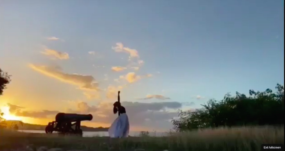 In another titled “The Land Of The Free,” Keepers of the Culture dance captain Reina Pelle-Joseph stood alone on a stretch of land, wrapped in a white skirt and the yellow-green of long, uncut grass. Just feet away sat an old cannon, hollow and still foreboding. Beyond it, a river reached out to meet the sky. From a low camera angle, Pelle-Joseph looked as if she was alone.