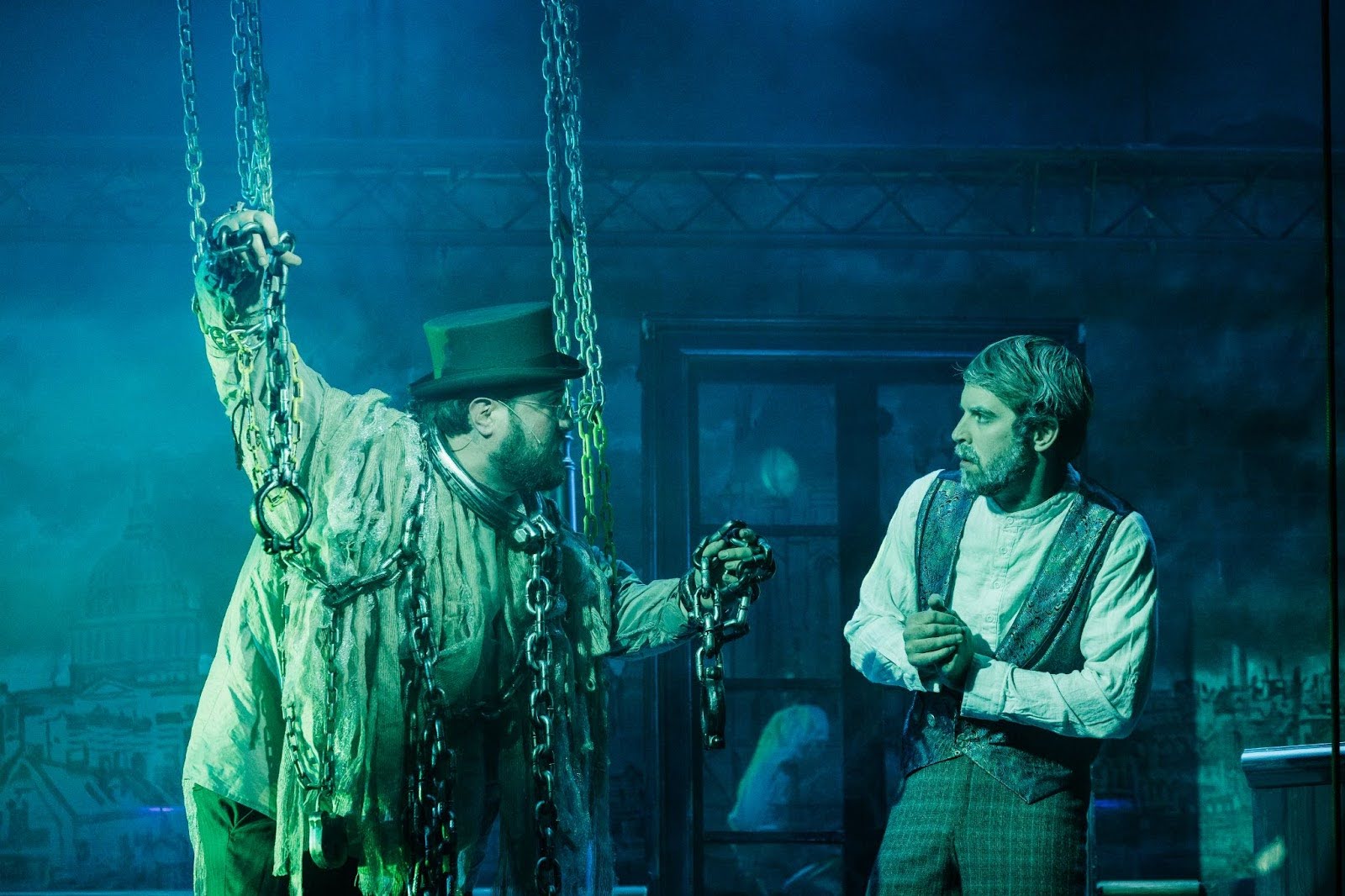 Onstage, the London streets became cold once again, years later, but this time, there was no joy. From the wings came carolers dressed in evergreen cloaks lined with fur, breaking the foreboding silence with song. Their shrill voices were too merry and light for this scene, perhaps: Marley thought so as he shouted, “Bah humbug,” at them, sending them back from whence they came.