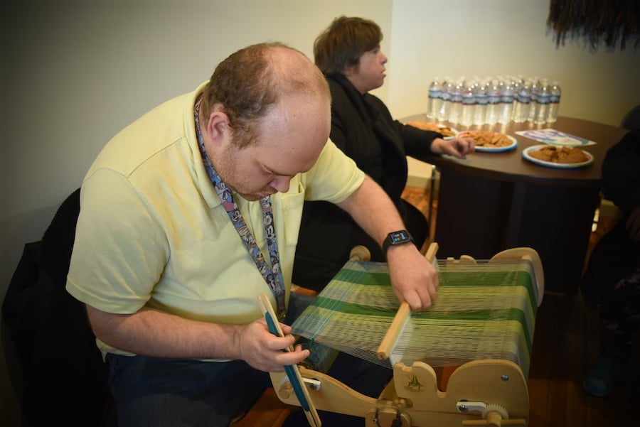 Out of 15 adults that regularly work at UARTS, eight were present at the ribbon cutting, including Danny Bress, who does a great deal of work on the cricket looms, weaving scarves, placemats, blankets and other textiles. He said weaving was his favorite activity, even though it’s a challenge to measure out the yarn and arrange it on the loom’s warp. He’s also learned new skills like painting and woodworking and formed deeper connections with some of his friends who are also in the program.