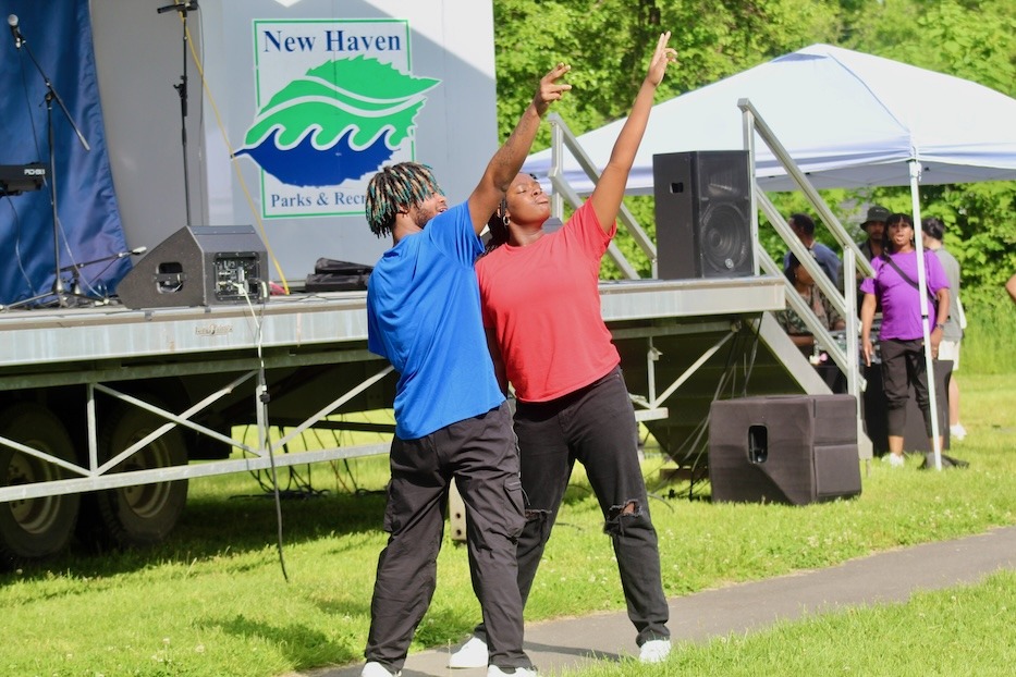 Throughout the park, that sense of celebration was palpable, flitting through the warm afternoon as attendees gathered across the grass and made their way to a vendor stations and tents for New Haven social service agencies. Close to the stage, dozens danced, some only with their hips, shoulders, and vigorously bobbing heads, and others hand-in-hand with children and family members in the grass.