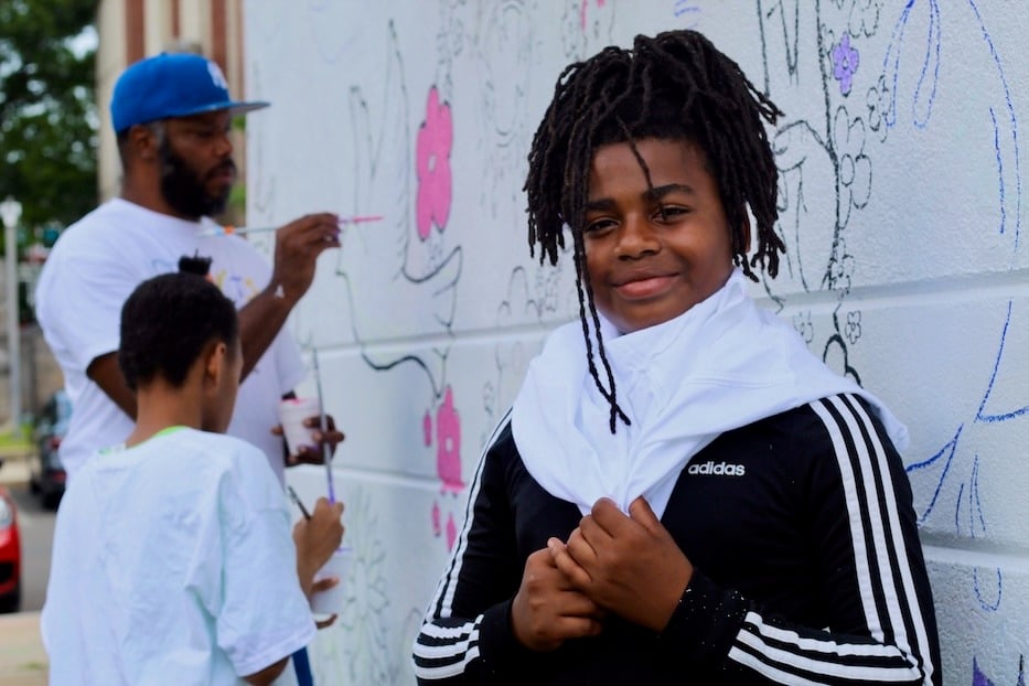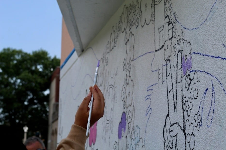 Less than two feet away, Grafton Street neighbors Thai Williams and Kaiden Reyes jumped in, fitting white CITYarts t-shirts over their heads before they gripped their brushes and got to work. Standing beside Perez, 12-year-old Williams filled in a pink flower, smiling as the brustrokes turned each petal a dusty pink.